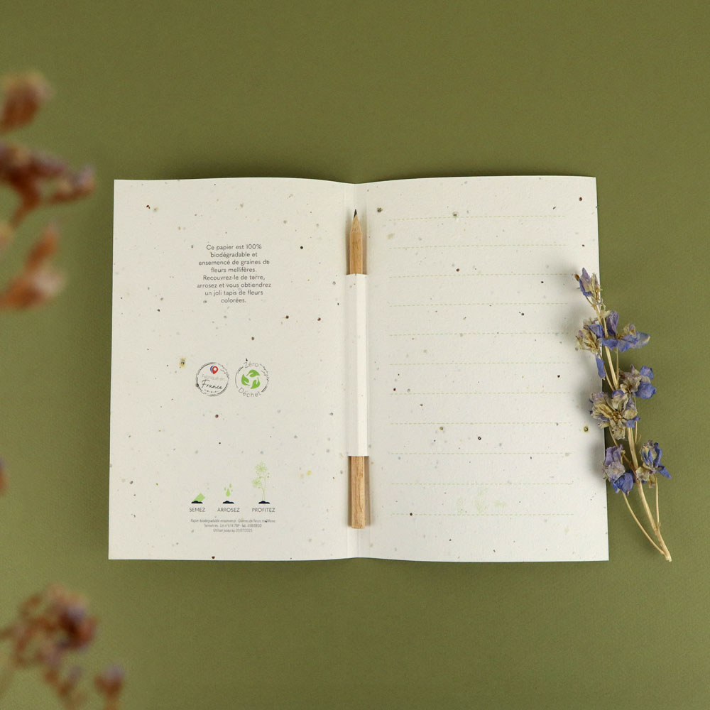 • Papier graines 200 g/m² – Format fini : 137,5x210mm – Format ouvert : 275x210mm