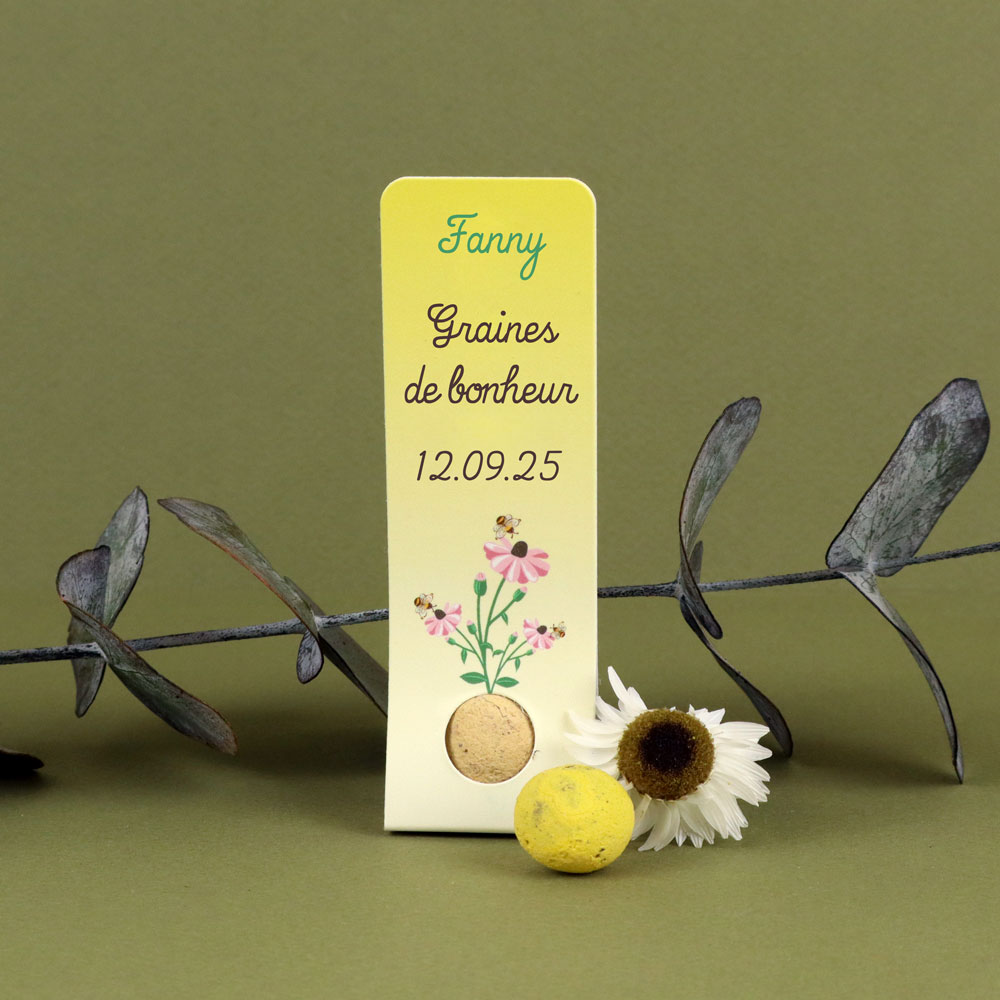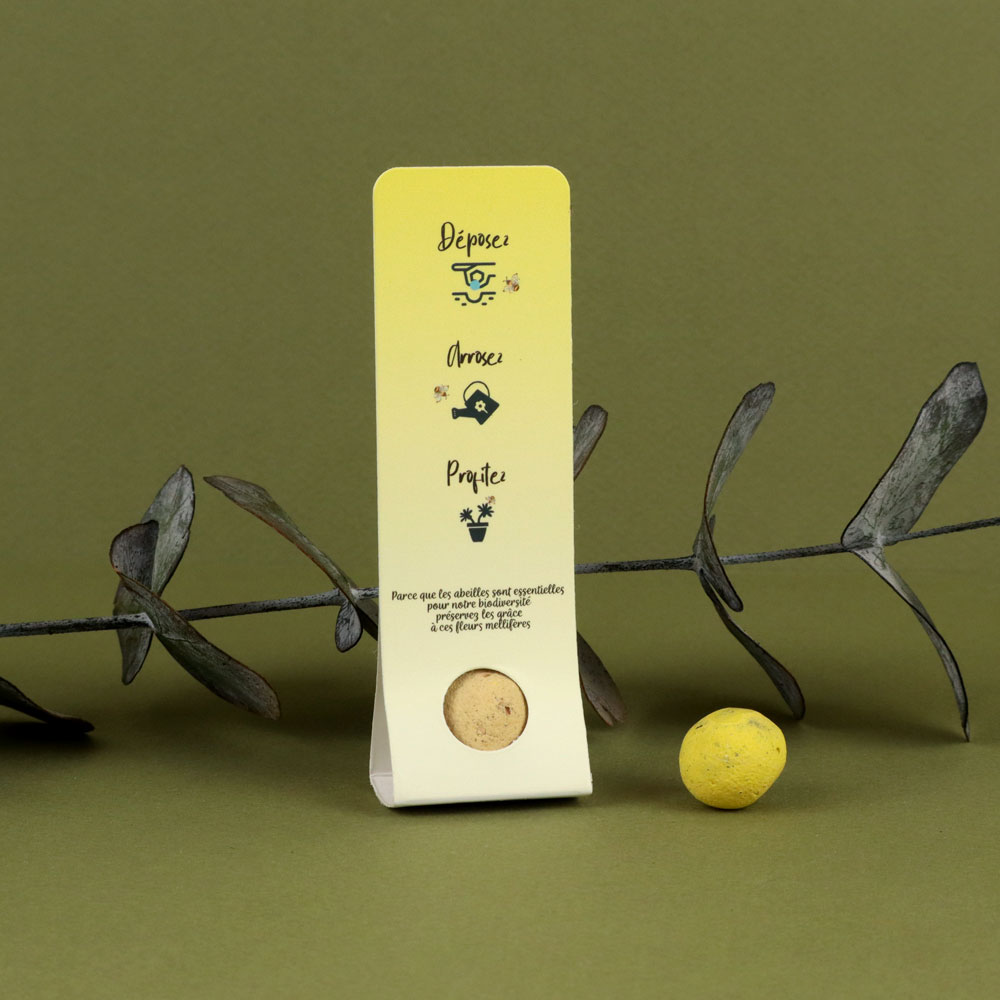 • 1 bille contenant un mélange de graines de fleurs sauvages (coquelicot, lin, bleuet, aneth, bourrache, trèfle, calendula…) Format : Ø15mm.