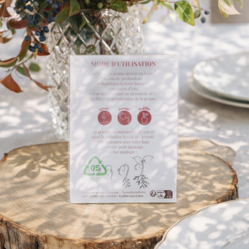 Cette graine gravée surprend et séduit : une fois germée, elle révèle le logo directement sur l’une de ses premières feuilles. Un goodies végétal unique, à forte charge émotionnelle, parfait pour marquer les esprits lors d’actions de communication symboliques.