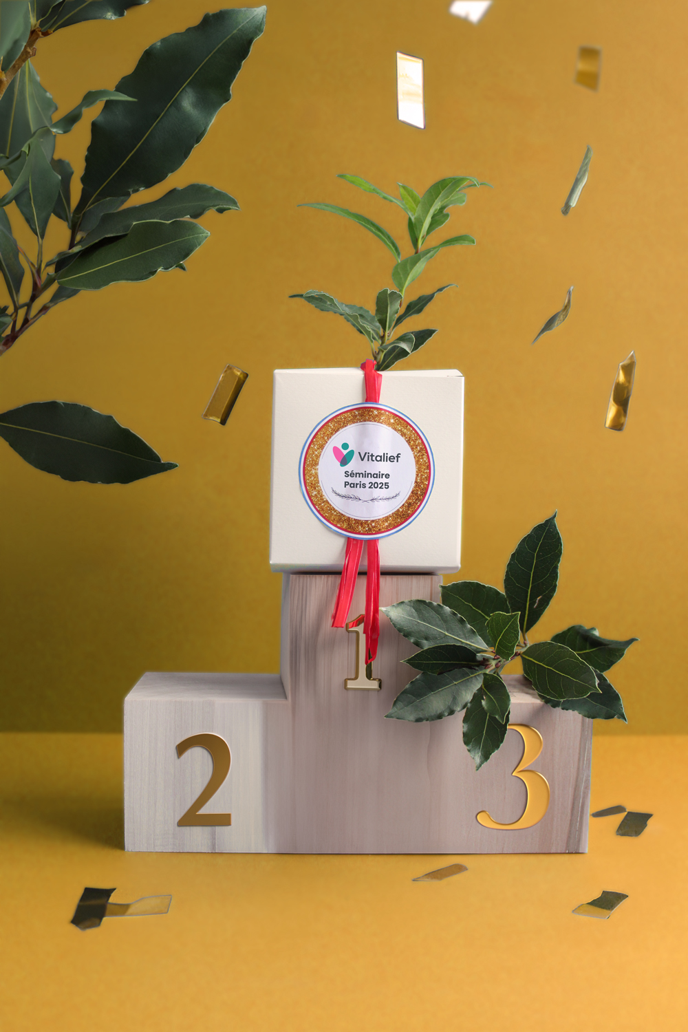 • Personnalisation de la boîte par un sticker format : 65x65mm.